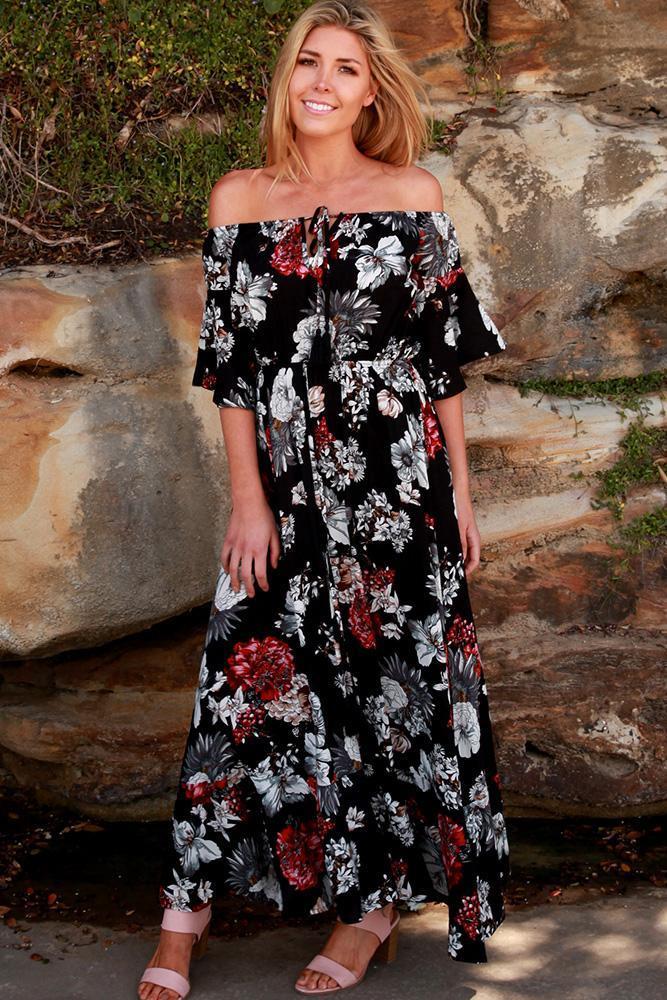Isabella Boho Off Shoulder Maxi Dress Black Floral